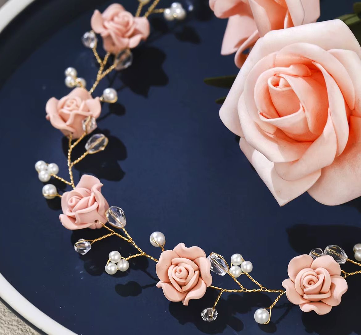 Rosenblüten, weisse und transparente Dekoperlen (Kunstoff) sind an einem soften Draht. befestigt
