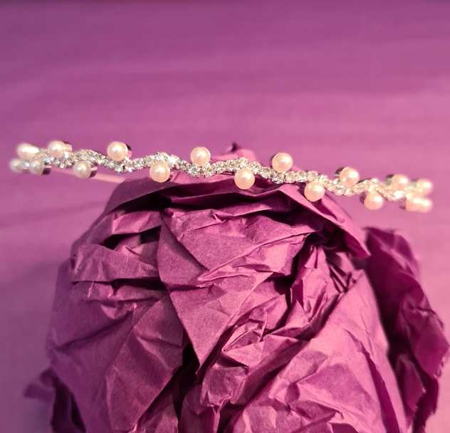 - silberfarbene, feine, elegante Tiara in Wellenform mit kleinen Perlen und Strasssteinchen