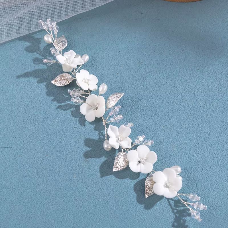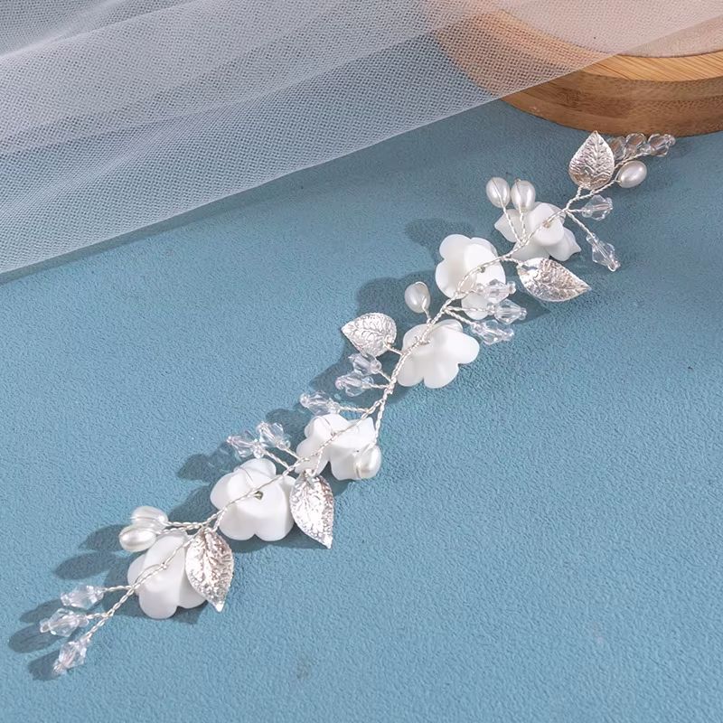 Weisse kleine Blüten, feiner, weicher Silberdraht - verziert mit kleinen Dekoperlen und Blättchen.