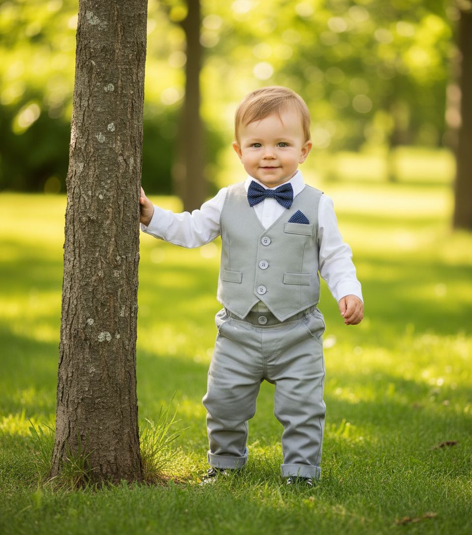Die separate Weste - mit süssem Einstecktuch - und die langen Hosen sind aus richtigen, leichtem Anzugsstoff, Baumwolle-Viskose Mix.