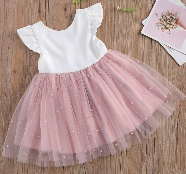 Schönes Altrosa, kombiniert mit Weiss. Die hübschen Ärmel und die Perlendeko im weichem Chiffon-Röckchen sind tolle Hingucker.