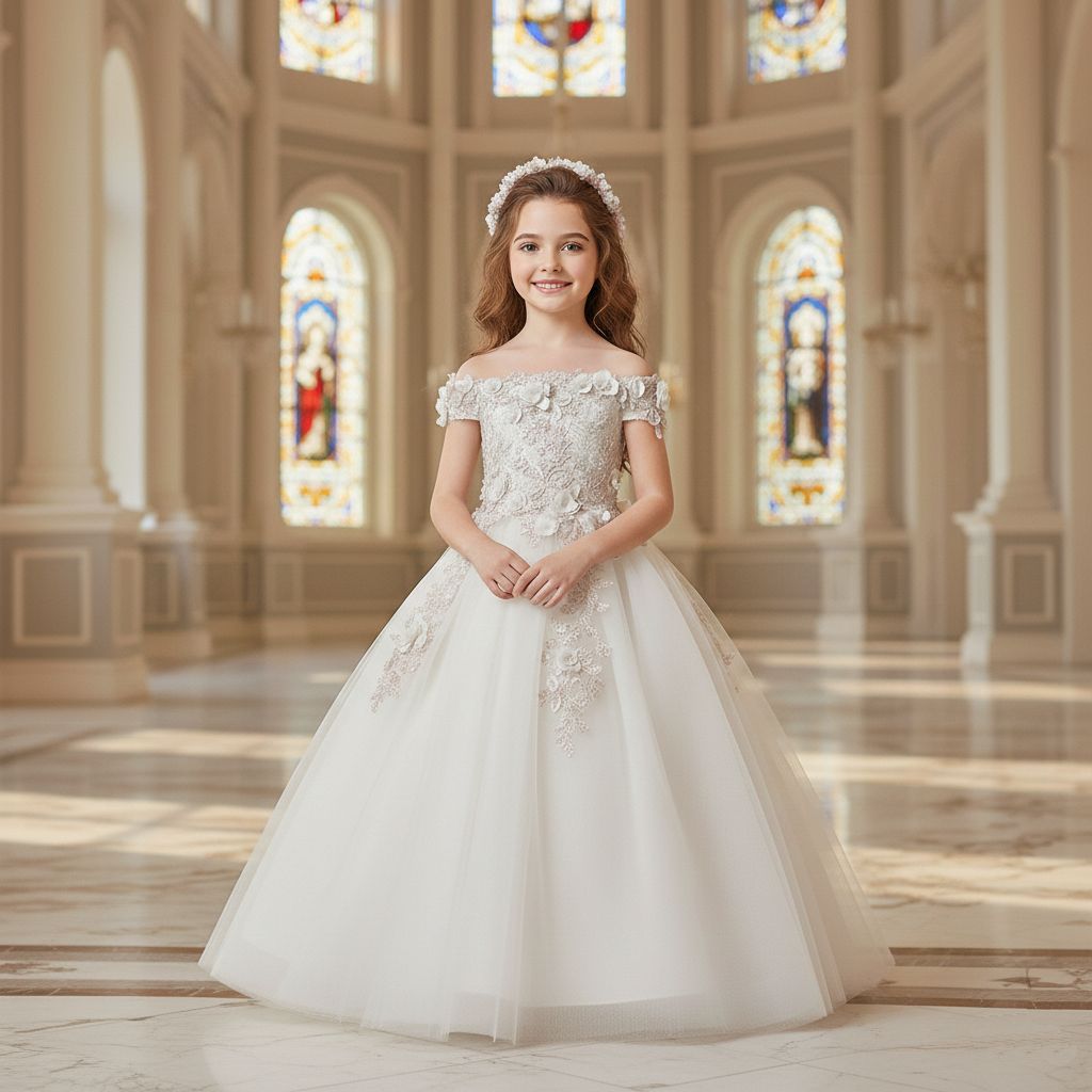 Dieses wunderschöne, schulterfreie Blumenmädchenkleid mit seinen zarten Blütenapplikationen passt perfekt zum festlichen Anlass!